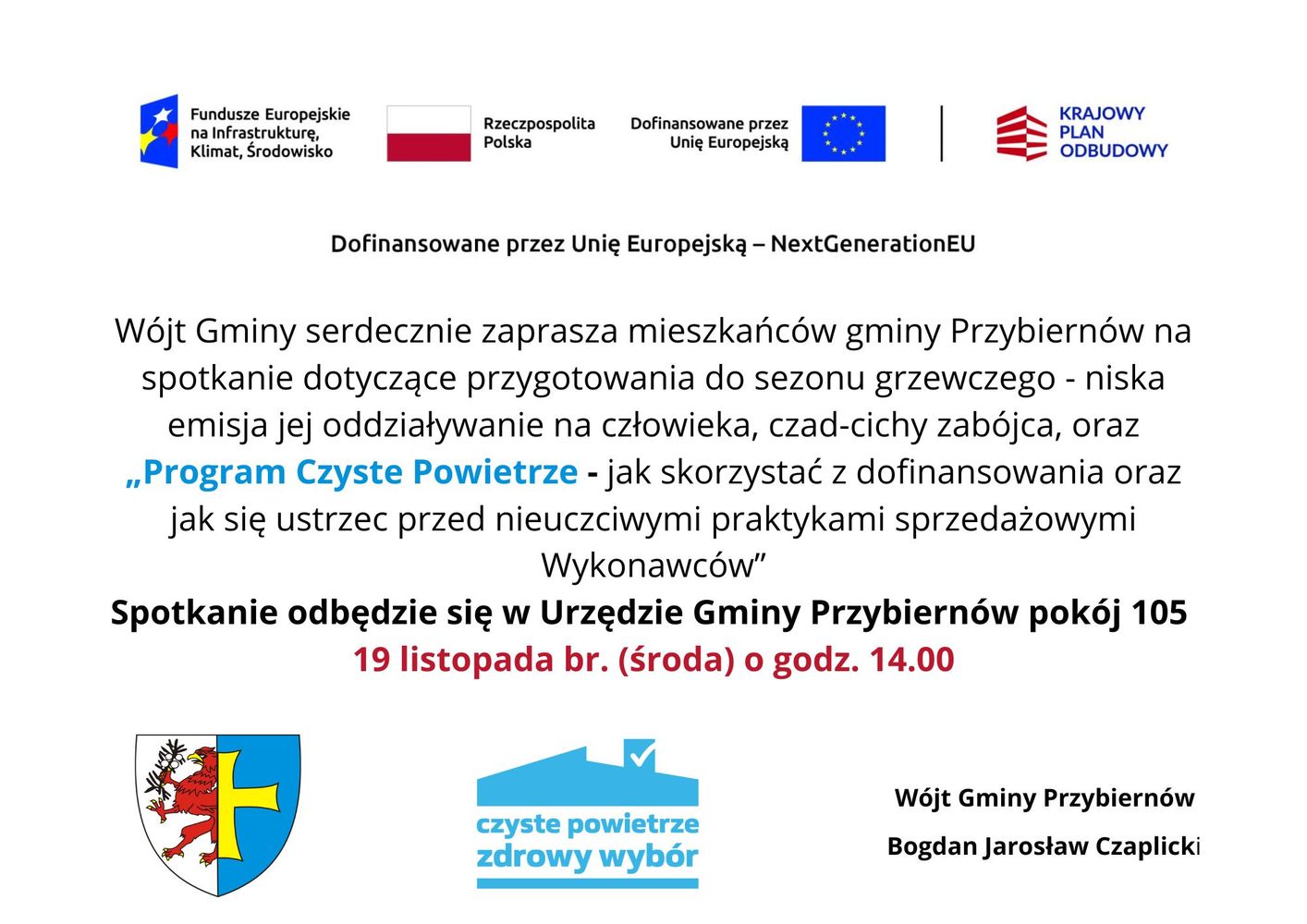 Niniejsza informacja zostaje podana do publicznej wiadomości poprzez zamieszczenie w Biuletynie Informacji Publicznej, na stronie internetowej oraz na tablicy ogłoszeń Urzędu Gminy Przybiernów.